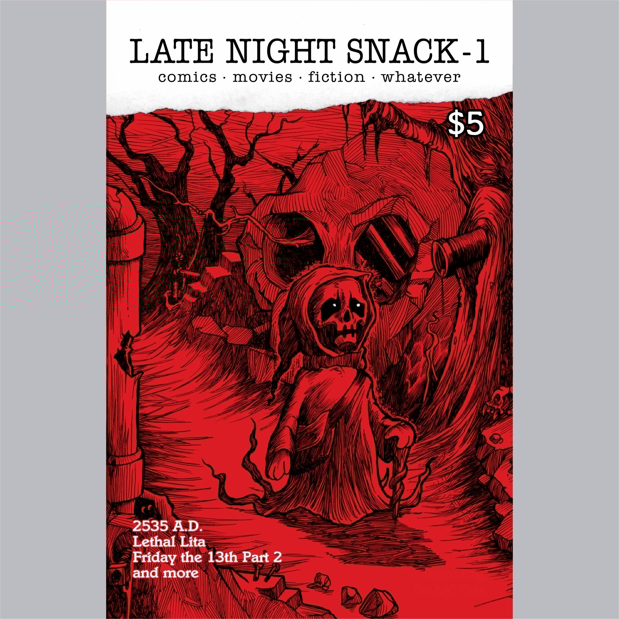 Late Night Snack issue 1- Feature comic stories, fiction, movie articles and and whatever else we could cram in to the 32 pages. Issue one has two new Lethal Lita stories, a new Plague of Man story, Horror on the Orient Express Column as well as the Slashed Column.
