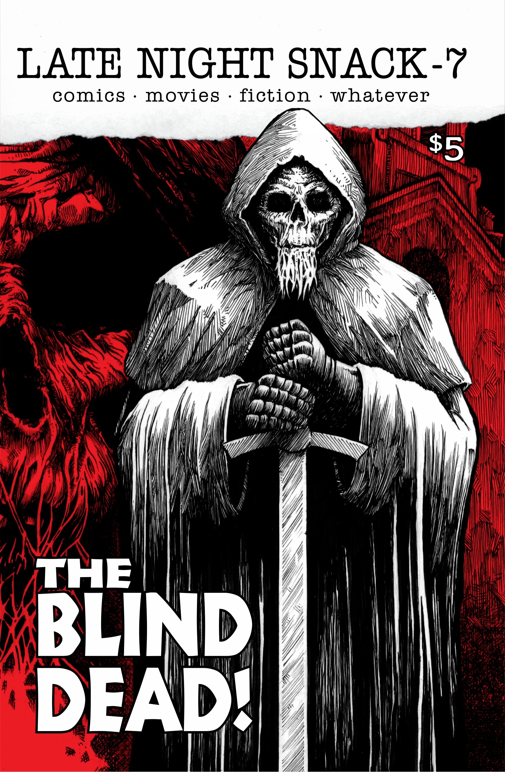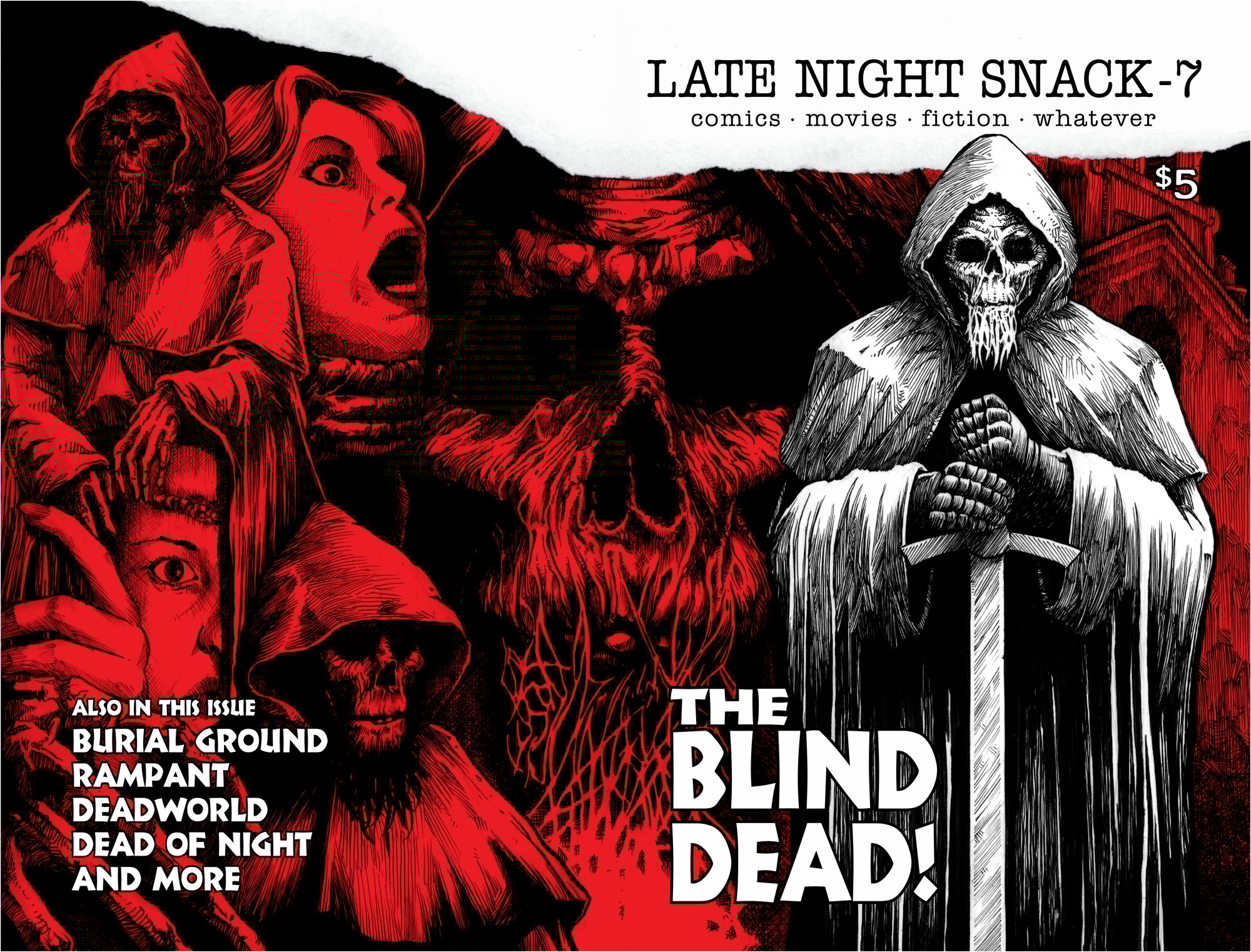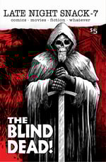 Late Night Snack issue 7- Zombies!!! This issue we review and talk about the living dead in various forms. The Child, Dead of Night, Redneck Zombies, Deadworld, a retrospect on the Blind Dead films and more. 52 pages of the gut munching dead.